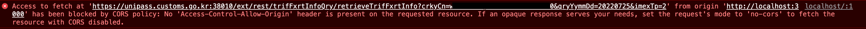 설정해 주지 않은 상태에서 출처가 다른 어플리케이션 끼리 공유 할때 CORS 정책을 브라우저에서 알려주는 것이다.