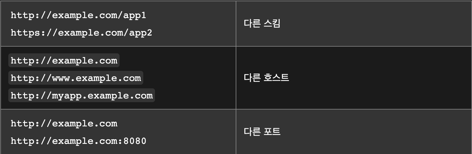 웹 콘텐츠의 출처(origin)는 접근할 때 사용하는 URL의 스킴(프로토콜), 호스트(도메인), 포트로 정의됩니다. 두 객체의 스킴, 호스트, 포트가 모두 일치하는 경우 같은 출처를 가졌다고 말합니다.
