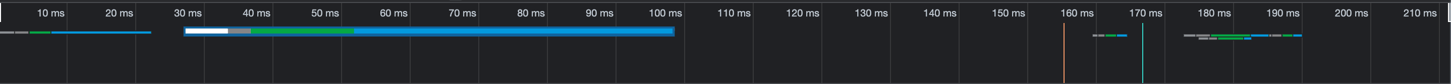 네트워크 창을 보면 0100ms 까지 하나의 파일 120270ms 정도에 여러개의 파일이 다운되는 것을 볼 수있다. 이는 처음에 html이 다운되는 시간, 이후에 js 파일이 다운 되는 것을 알 수 있다.