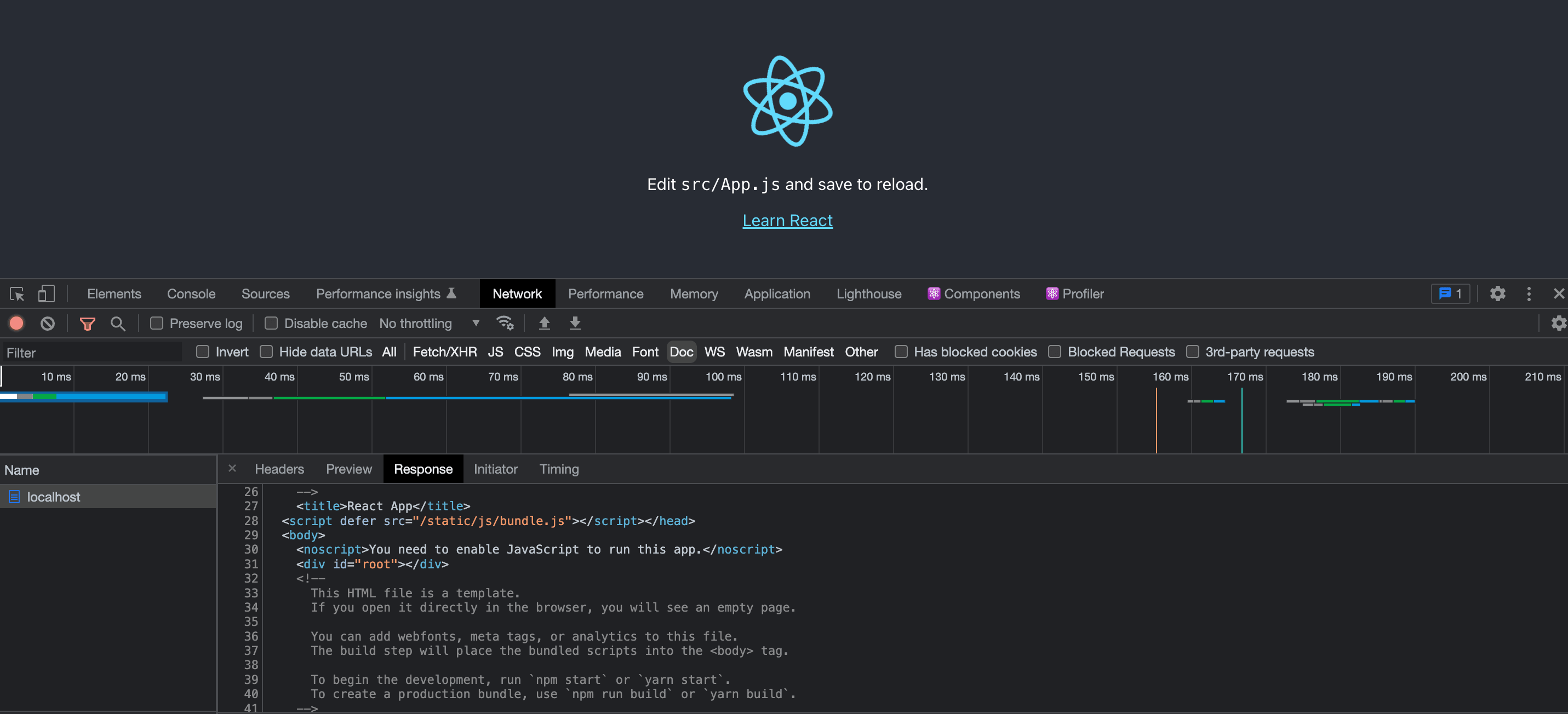 Network를 보면 localhost의 html 파일을 볼수있다. 화면에는 리액트 마크와 여러 content가 있다. 하지만 body안에는 id가 root인 텅텅 빈 div 태그를 볼 수 있다.