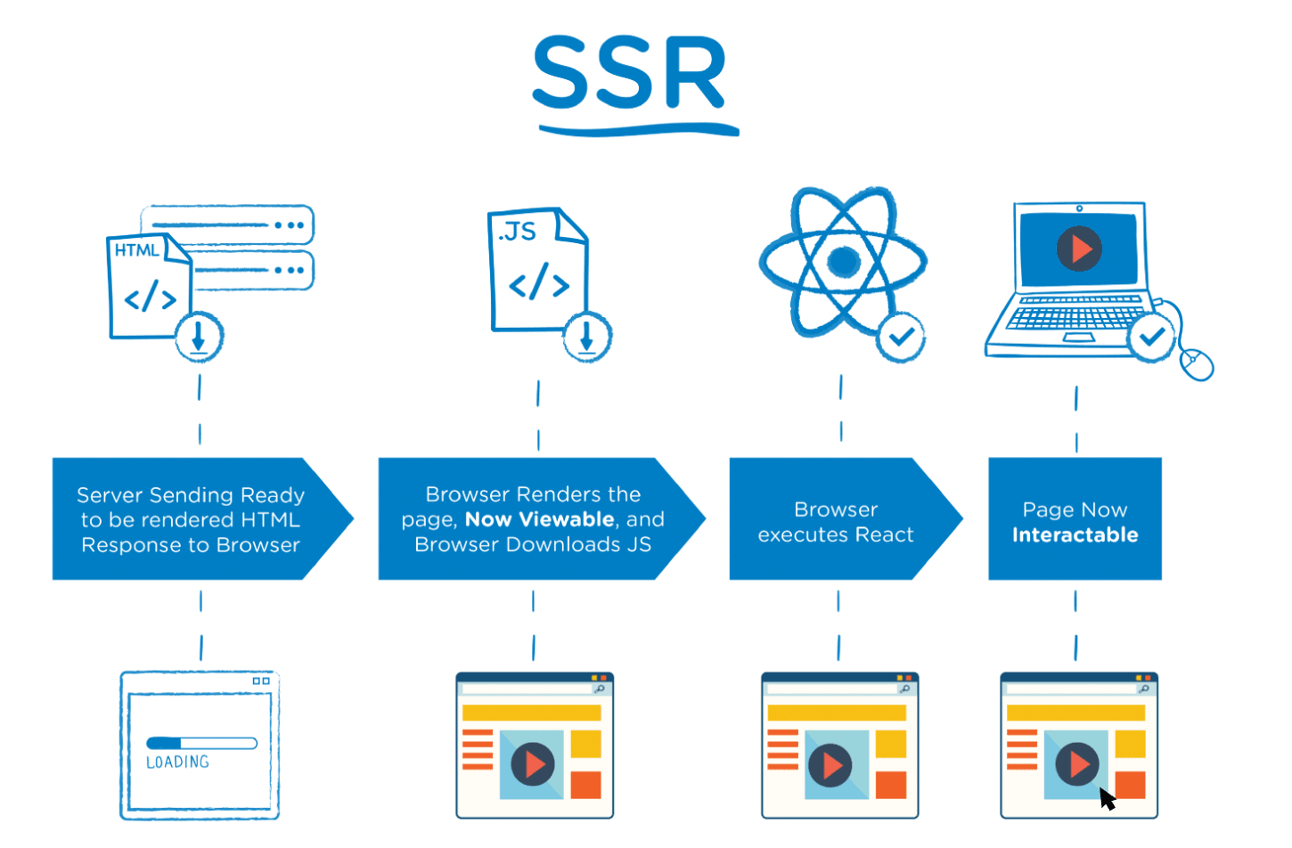 먼저 서버에서 렌더된 HTML 파일을 브라우저에 제공한다. 브라우저는 즉각적으로 유저에게 컨텐츠를 보여준다. 그 뒤 JS 파일이 다시 다운받게 되고 유저는 JS에 관련된 기능들을 사용할 수 있게된다.