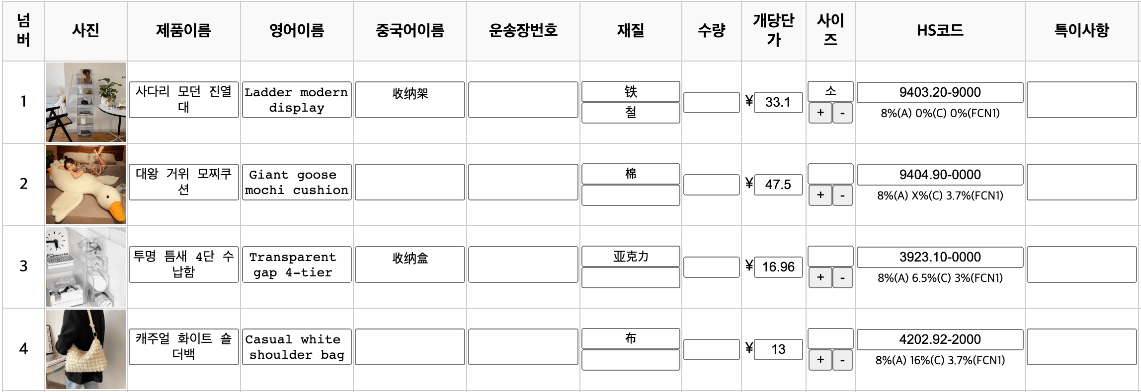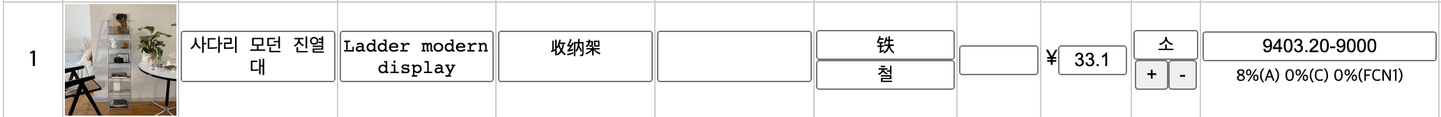 {ko:'사다리 모던 진열대',en : 'Ladder modern display', ... ,Hscode:'9403209000',id :'acxz123czxdas'}