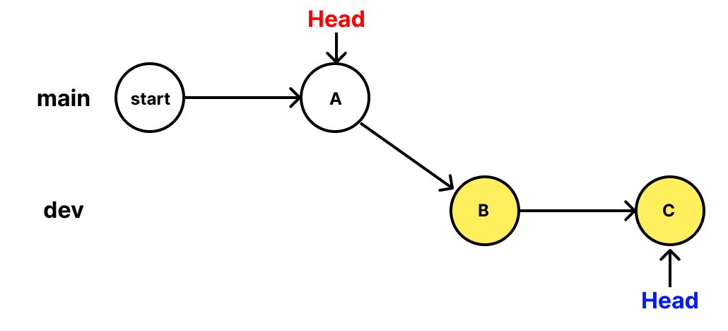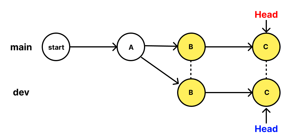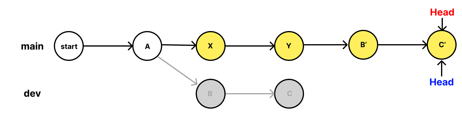 dev의 B와 C 커밋 그 자체가 main에 복사 된다고 생각하면 된다. (커밋의 해쉬값 까지 동일하다)