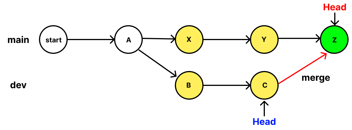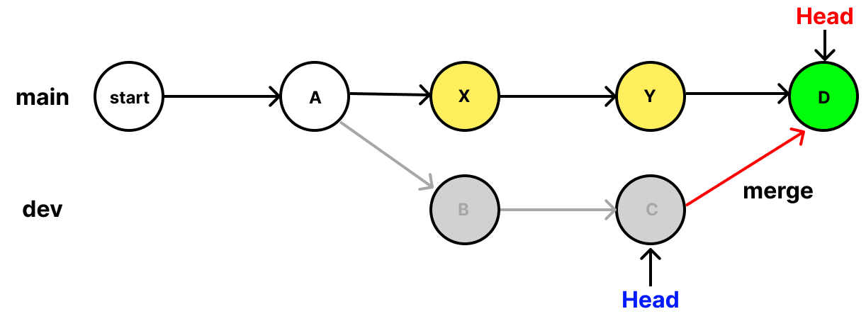 이처럼 A Commit 에서 분기된 dev 브랜치가 B,C 작업을, A Commit 이후 main 브랜치에서 X,Y작업을 진행한 상황에서 dev 브랜치의 작업을 main에 Merge를 해야할 때가 있다.