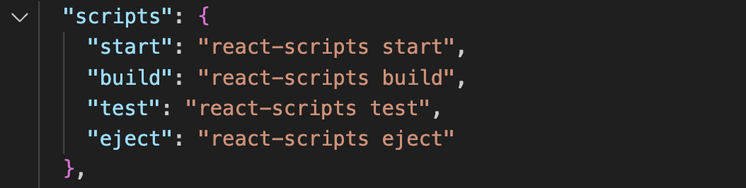 CRA에서 기본적으로 제공하는 스크립트는 start, build, test, eject 정도가 있네요. 사실 우리가 위에서 실행한 start의 경우 npm이 pakage.json의 start에 해당하는 react-scripts의 start 명령어를 실행했다고 추측할 수 있습니다.