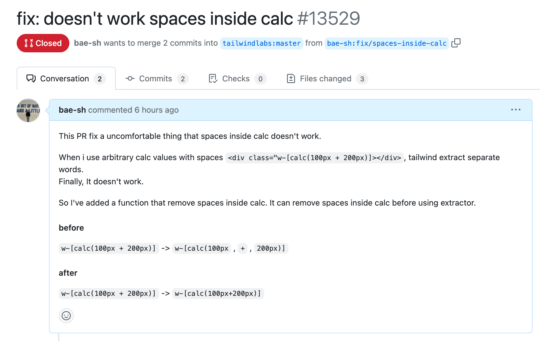 w-[calc(100px+200px)] 와 같이 공백을 제거해 문법에 맞게 작성하면 가장 단순한 해결 방식이지만 분명 저와 비슷한 불편함을 겪는 개발자가 있을 것이고 tailwindcss에 기여해보면 좋지 않을까 생각하여서 도전해보았습니다.